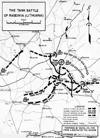 The result of the battle was the destruction of most of the Soviet armoured forces of the Northwestern Front, which cleared the way for the Germans to attack towards the crossings of the Daugava River (Western Dvina). The fighting around Raseiniai was one of the main battles of the initial phase of Operation Barbarossa, referred to in Soviet historiography as the Border Defensive Battles (22–27 June 1941) and formed part of the larger Soviet Baltic Strategic Defensive Operation.