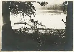 Captain Marsh was unhurt and ordered his men to fall back to the ferryhouse, only for the Dakota warriors who had taken over the ferryhouse unnoticed behind him to open fire in the right rear.[8][1][11] The captain ordered an about face. His men closed ranks, advanced, and fired a volley, but it was mostly in vain, as more of them fell.[8] On Marsh's command, the surviving men broke for cover in the thicket extending downstream for two miles.[8][1] The Dakota warriors skirted the thicket from a distance, too far for their shots to reach Marsh and his men.[8] Finally, as the timber and underbrush thinned, Marsh decided to cross the stream to avoid further fire, and attempt to find their way back to the fort on the south bank.[8] A confident swimmer, Marsh entered the water first, but suffered a cramp and drowned, despite the efforts of two of his men to save him.[1][12]