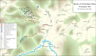 The situation changed decisively on 18 December with the arrival of the Schurtter Brigade in Brassó.[20] In relation to the direction of the planned imperial attack, the left flank was at Földvár, where the 3rd Battalion of the 24th (Parma) Infantry Regiment and the Landwehr Battalion of the Sivkovich Infantry Regiment arrived on 20 December.[20] Under the command of General Schurrter, the new Austrian force arrived. He joined forces with Gedeon's army to create the numerical and technical superiority that would bring Háromszék to its knees.[21]