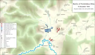 Horváth's detachment set off on the designated route on 12 December, and by the evening they had to reach Nagybacon. The next day they wanted to arrive early at Barót to surprise the Dragoons they had expected to find there.[1] However, this failed, because the imperial outpost received news of the Székely movements, so he retreated to his camp. The early arrival did not succeed either, because the infantrymen arrived at the place determined by Horváth only after a considerable delay, at 8 o'clock in the morning of 13 December.[14][15] After it became clear that Heydte had been informed of the Székely presence, Horváth decided not to march as far as Olasztelek, but to attack from the hill north of Barót, where he had deployed the infantry.[3] Horváth observed the enemy from the chapel on the hill, whose camp he saw in front of the edge of Felsőrákos, leaning towards Alsórákos, guarded by 68 dragoons posted on two sides around the Rákos stream.[15] On the hill, Major Butyka lined up his infantry, with Count Imre Kálnoky standing 200 paces behind him with his spearmen.[15] In the morning, Gál's detachment also arrived, after leaving Köpec crossed the Barót stream, and then took up the battle order.[3] He brought there the two six-pounder guns of Áron Gábor, obviously covered by cavalry, while the riflemen must be used by Gál, who was a highly trained officer, in a standard skirmish line.[3] The commander also placed horsemen behind the infantry to close the ranks and reinforce the infantry. In reality, the detachment of Gál did not intervene in the battle, only the fire of the guns contributed to the success that was to come.[3]