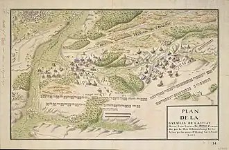 By 14:00, the Allied troops were in position, and William ordered a simultaneous assault on Luxembourg's left and right flanks.[20] When Villeroy, who was in charge of Saint Denis, reported the Allies were advancing on the Abbey, Luxembourg ordered his artillery and baggage train to withdraw towards de Montal's positions at Saint-Ghislain. About 15:00, Dutch troops under Count Waldeck captured the Abbey despite heavy losses, William's secretary later noting some 300 to 400 corpses littering the ground in front.[1] They then drove the French back to the creek, which ran through the battlefield, but Allied attempts to cross it and break Villeroy's front line ultimately failed.[21] At the same time, Spanish and Dutch infantry, which included the Scots Brigade, attacked Casteau and captured most of the village.[22]