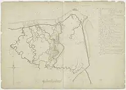 Surabaya was defended by fortifications, artillery and a "substantial" number of men.[9] The defenders had at least 120 cannons.[2] Trunajaya's forces were technologically on par with those of the VOC, since VOC technical innovations had been quickly adopted in Java.[10] Two rivers, the Kali Mas and Kali Pegirian, flowed through the city into the Madura Strait in the north.[9] Trunajaya had established his court in an old royal citadel (around the location of today's East Java Governor's office) and diverted the Kali Mas to form a moat around it.[9] However, during the battle, the moat was dry because of the dry season during the east monsoon.[9] Trunajaya had established his main line of defence along the river north of the citadel, building elevated fortifications and palisade barriers, and emplacing two artillery batteries.[9] The more easterly Kali Pegirian flowed through Ampel, a district of Surabaya containing the grave of Sunan Ngampel-Denta, one of the Wali Songo.[9] In contrast to the western sector, this sector (Trunajaya's right flank) was lightly defended; only palisade barriers were built across the river.[2] The distance from the coast to Trunajaya's main defenses, around 4.5 kilometres (2.8 mi), mostly consisted of marshy ground covered with scrub, and was underwater at high tide.[2]