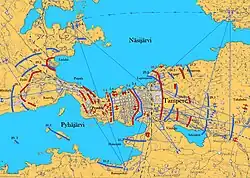 The Battle of Tampere was a 1918 Finnish Civil War battle, fought in Tampere, Finland from 15 March to 6 April between the Whites and the Reds. It is the most famous and deadly of all the Finnish Civil War battles.[2][3] Its bloody aftermath saw the Whites execute hundreds of captured Reds with another 11,000 prisoners sent to the Kalevankangas camp.[4]
