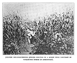 On the Japanese side were the 3rd, 4th, 5th and 6th Divisions of the Japanese Second Army under General Oku Yasukata.[1] The combined force had over 64,000 men, including 46,000 infantry, and 252 guns. After the victory at the Battle of Telissu, General Oku rested for four days for re-supply, which was delayed due to heavy rains, and to bring his 6th Division up to full strength. Although the Japanese were moving parallel to the railway line and the Russians had left behind over 300 freight cars at Dalny, the Japanese were unable to utilize the railway due to lack of locomotives. Locomotives procured by the Japanese matching the Russian railway gauge prior to the start of the war had been sunk by Russian commerce raiding in the Sea of Japan. The Japanese improvised by hauling the freight cars by teams of 16 men per car, and in addition hired 70 junks from the Chinese to move supplies up the coast to a point a couple of miles from the Japanese troop deployment.