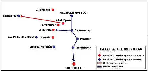 At the end of November 1520 the Captain General of the Santa Junta, Pedro Girón y Velasco,[note 1] mobilized the bulk of his army towards Villabrágima, at the same time that other smaller detachments occupied Villafrechós, to the north, Tordehumos, to the southwest and Villagarcía de Campos and Urueña, to the south. In this way the distance between the troops of the lords, grouped in Medina de Rioseco, was shortened to a league and hostilities seemed inevitable. However, the nobles commanded by the Count of Haro refused to take the initiative. They only limited themselves to impede the enemy's advance and cut their lines of communication by occupying towns such as Mota del Marqués, San Pedro de Latarce, Castromonte or Torrelobatón.[1]