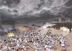 Jeon placed his army so that the rebels stretched sixteen kilometers, from Panchi to Mount Bonghwang. Jeon was at the center of this line, surrounded by flags and riding on his white horse. The government forces defended the sides (Hyopyo, Ungchi, Mount Bonghwang), while the Japanese were stationed in Ugeumchi proper. At 10:00 am, the rebels charged at Ugeumchi.[9] He sent two battalions of the Donghak Peasant Army advanced from Gyeongcheon to the southeast of Gongju Castle, and another detachment began pressuring the government forces, stationed in Iin, from the southwest to lure them away so that the major rebel forces would not meet a large governmental army in Ugeumchi.[9] Finally, around 3 p.m., the first division crossed Panji and attacked Yiyin and Hyopo, diverting the attention of the government forces in that direction. At the same time, the second division, consisting of about 10,000 soldiers, advanced towards the government forces stationed in Iin. The other 30,000 rebels were crossing Ugeumchi. However, they encountered a Japanese battalion of 280 soldiers. The Japanese gathered the Korean forces into Ugeumchi. Japanese Lieutenant Moriya, who was in overall command, repelled the attack with about 280 Kyungricheong soldiers and defended Ugeumchi with a Japanese battalion.[5] Throughout the night, both sides fiercely confronted each other, lighting fires and firing guns and cannons. As the day broke, they entered into a decisive battle.[2][6]