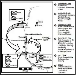 In June, a small contingent of 72 troops, 48 American and 24 Afghan, were operating in and around Wanat, that was the center of the Waygal District government and about 5 miles (8.0 km) from the coalition military base Camp Blessing.[8][9][16] On July 4, a US Army helicopter attacked vehicles they claimed were firing on them and killed 17 people. Both sides reported Forward Observation Base (FOB) Bella was under attack by indirect fire and small arms fire. The attack occurred in the middle of a multiple day relocation from Bella to Wanat designated Operation Rock Move [17] that left the small base vulnerable. Moving quickly to take advantage, Taliban forces attempted to cut off a squad from the 19th Engineer Battalion that remained at Bella waiting to be extracted to Wanat. Staff sergeant Todd Barfield, Specialist Benjamin Bond, Private first class (Pfc.) Jason Vails, Pfc. Randall Durry and Pfc. Todd Wile, with the help of artillery support from Camp Blessing were able to successfully defend Bella against multiple attacks by Taliban forces. Intelligence reports said that the FOB was going to be overrun from within the base as well. Intelligence received afterwards claimed that the attack was in response to the July 4th helicopter attack that left a reported 17 civilians dead.[11] American Reports[18] claimed that the helicopter attack was in response to the indirect fire received from a mortar tube that was being fired from the bed of a Toyota Hilux pick-up.. The initial Taliban radio transmissions that were intercepted reported that the "... big gun [mortar tube] had been hit ..." and the Taliban commander had been killed. A few hours after the helicopter attacked, with the Chosen Company commander and the troops in contact confirming the targets, the Taliban radio reports changed to "... they killed the shop keeper [that had the same name as the Taliban commander], the big gun was not damaged." Tension between American forces and Afghan Army forces were already high after Sfc. Matthew Kahler was killed by an Afghan Army soldier earlier in January.[19] While the killing was officially ruled an accident, the US soldiers considered it intentional.
