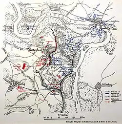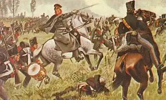 By 2 p.m. the Württembergers had been dislodged from Bleddin, and Beaumont's cavalry swept aside by the Prussian Hussars. Wartenburg was now threatened from the east by Steinmetz and from the south by Mecklenburg.[5] The decisive blow came from Horn's brigade. Passing through an orchard, and crossing a stream and two dikes, they fell upon Fontanelli's men, who had been called forward to reinforce Morand.[8]