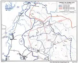 On March 15, the XIV Corps was reassigned to the south, while the XI Corps under Gen. Charles P. Hall took over the assignment to face the Shimbu Group.[8] On the southern end of the Shimbu Line, the 43rd Infantry Division went on a southern sweep on a two-pronged attack towards Tanay, Pililla, swinging north along the Morong River valley. The 43rd Division's mechanized forces eliminated Japanese strong points along the way, and with the capture of Mount Yabang as well as Mount Caymayuman northeast of Antipolo, it was practically able to eliminate the Noguchi Force, and close the southern escape routes and box in the Shimbu Group.[6][8]