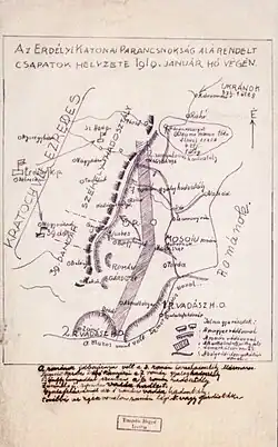 Crossing the second alignment of the demarcation line,[1] after securing Cluj, the Romanian armed forces continued to slowly press forward.[2] The French general Louis Franchet d'Espèrey appreciated that, in the context in which the final goal of the Romanians was to occupy territories in accordance with those recorded in the secret treaty from Bucharest, a Romanian-Hungarian war was imminent.[3] Although no open conflict has yet been reached as an effect of the fact that, on January 21, 1919, d'Esperey ordered the Romanian military advance to stop, on January 23, however, the Hungarian Council of Ministers decided, for the first time, that it had no other solution than armed resistance. A new order from January 28 of the French Prime Minister Georges Clemenceau determined the fixation of the Romanian armies on the new alignment,[4] which, in Sălaj county and at the level of its border with nearby counties, passed around the edge of the localities Băsești – Chilioara – Crișeni – Panic – Aghireș – Șeredei – Pria – Ciucea.[5]: 199 On the Romanian side, the winter of 1918–1919 was used to lay the foundations for the establishment of the 16th and 18th divisions (made up of former soldiers of the Austro-Hungarian Army) and for the more thorough organization of the other Romanian divisions, as well as for training and equipping the troops.[6] On the Hungarian side, however, no significant progress was made in the field of military organization. The only tangible results were represented by those of the Székely Division which, despite serious financial and disciplinary problems, had nevertheless constituted troops capable of opposing the Romanian advance.
