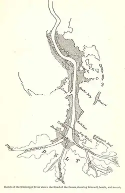 As a signal to release the fire rafts she was to fire three rockets. The first of these rockets was fumbled and flew back inside the Manassas, briefly panicking her crew. Recovering, the three rockets were fired. Alarmed by the rafts, the vessels of the Union fleet slipped their anchor cables and moved downriver along the Southwest Passage, firing at the Manassas while doing so. Some of these projectiles knocked down one of the stacks of the Manassas, her only vulnerable projections above the rounded upper armor deck. Filling the ship with smoke while the crew cut loose the damaged stack, she grounded on the mud on the west bank of the head of the passes. The Union fleet headed to the southwest, pursued closely by the Confederate gunboats. The fire rafts grounded on the west bank of the southwest passage, south of Manassas. The rebel gunboats, once freed of the glare of the rafts between them and the targets, opened fire on the Union fleet.[18]