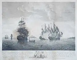 The Battle of the Mona Passage was a naval engagement on 19 April 1782 taking place in the aftermath of the Battle of the Saintes between Britain and France during the American Revolutionary War.[4][5] A British fleet under Rear-Admiral Sir Samuel Hood, pursued a small French fleet under Georges-François de Framond which had managed to escape the victorious British fleet a week earlier. The two fleets met and engaged at the Mona Passage where the British overtook and captured four French ships, two of which were 64-gun ships of the line.[6]