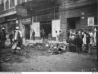 As 2 April 1915 was Good Friday, many ANZAC troops waiting to go to the Gallipoli Campaign were on leave, and many of them went to the Birka. They had an accumulation of grievances against the entertainments in the Birka: beer adulterated with water or even urine; high prices; much venereal disease among the area's prostitutes; theft and general dishonesty; an incident when an English soldier from Manchester found his sister serving as a nude dancer and prostitute there (she had accepted an offer for a job in domestic service, but her purported employer took her to Cairo and left her there: see white slave trade), and when he tried to take her away, the brothel's staff threw him out of an upstairs window.[3][4] About 4000 troops rioted and wrecked and burnt many buildings, and threw prostitutes and pimps out onto the streets and their possessions after them; furniture including a piano was thrown out of upstairs windows; and they rescued the English soldier's sister. The riot started about 4 pm or 5 pm and ended by 10 pm.[5]