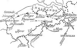 Part of northern France and north Belgium from the Pas-de-Calais to the Scheldt estuary had been known as Flanders since the eleventh century. West of a line between Arras and Calais in the north of France lie chalk downlands covered with soil sufficient for arable farming, and east of the line the land declines in a series of spurs into the Flanders plain. By 1914, the plain was bounded by canals linking Douai, Béthune, Saint-Omer and Calais. To the south-east, canals run between Lens, Lille, Roubaix and Kortrijk, the Lys river from Kortrijk to Ghent and to the north-west lies the sea. The plain is almost flat, apart from a line of low hills from Cassel, east to Mont des Cats (Katsberg), Zwarteberg (Mont Noir), Rodeberg (Mont Rouge), Scherpenberg and Kemmelberg (Mount Kemmel). From Kemmel, a low ridge lies to the north-east, declining in elevation past Ypres through Wijtschate (Wytschaete), Geluveld (Gheluvelt) and Passendale (Passchendaele), curving north then north-west to Diksmuide where it merges with the plain. A coastal strip about 10 mi (16 km) wide is near sea level and fringed by sand dunes. Inland the ground is mainly meadow, cut by canals, dykes, drainage ditches and roads built up on causeways. The Lys, Yser and the upper Scheldt have been canalised and between them the water level underground is close to the surface, rises further in the autumn and fills any dip, the sides of which then collapse. The ground surface quickly turns to a consistency of cream cheese and on the coast troop movements were confined to roads, except during frosts.[19]