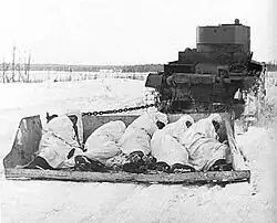 A battle sled (battle sledge, tank sledge or armoured sledge) is a protective device dragged behind an armored vehicle that is used to carry infantry closer to the front lines of a battle zone. They were used by multiple combatants during World War II.
