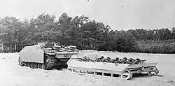 The United Kingdom tested armoured sledges, but did not use them in battle for troops. A Churchill tank was used to tow an experimental armored sled in the test.[4][5] The AVRE trailers test was done by the Armoured Vehicle Royal Engineers. United Kingdom battle sleds were used to move battle stores and ammunition. Centaur tanks and M7 Priest were used to tow the ammunition porpoise sledge at the Normandy landings on Juno Beach. The porpoise sledge had a low profile and was stored under the tanks on the landing crafts. The porpoise sledge has water tight storage bays for the ammunition.[6][7][8]
