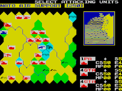 The game is a turn-based strategy and revolves around a fictional conflict between the powers of NATO and the Warsaw Pact.[1] The player has the choice of choosing to control either NATO or Warsaw Pact forces at the beginning of the game.[2] The player will begin the game on either side of Europe depending on which side was chosen; if NATO was picked, the player will start at western European countries (France, West Germany, Denmark)[3] whereas if the player sides with the Warsaw Pact, the game will begin in eastern Europe.[4][2] The map is hexagon-shaped and allows the player to move their units in six directions.[4] Each side has a variety of units; infantry move at a slower pace than mechanised infantry however armoured units are able to withstand more damage than regular units.[2] The game displays two maps on screen; the larger, central map displays the current situation whereas a smaller map to the corner of the screen displays a mini-map of Europe, which runs north from Denmark to southern France.[3]