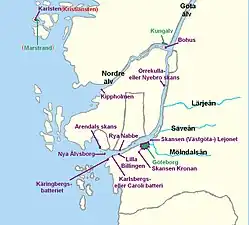 Two of the Gothenburg Squadron's frigates, the Fredericus and the Halmstad had been leased to the Gathenhielm privateers. The Halmstad was equipped, but undermanned. These two frigates as well as an additional two from Nya Varvet, formed a blockade in Göta älv between Nya Varvet and Rya Nabbe. Strömstierna supplied the vessels with barricades so as to prevent the Danes from boarding them.[19] Additionally, Nya Älvsborg fortress had been reinforced with a crew of 400 soldiers and 90 cannons. The two cannon batteries Lilla Billingen and Rya Nabbe, with 12 heavy cannons each had been manned with infantry from the Saxon Infantry Regiment led by Colonel G.D Zengerlein. In addition, the Småland Regiment as well as an elite unit, the Grenadier Battalion led by Johan Clausen, which composed of handpicked grenadiers from different units, were assigned to man the forts. In total, there were around 1000 Swedish soldiers and 200 cannons at the rivermouth of Göta älv.[20]