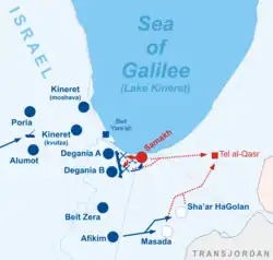 At night, a Syrian force attempted to surround the Israelis by crossing the Jordan River to the north of the Sea of Galilee, but encountered a minefield in which a senior Syrian officer was wounded.[1] This was spotted and reported by the Israelis at Tabgha,[21] and the additional reprieve allowed the Kinarot Valley villages to evacuate the children, elderly and sick, as well as conduct maneuvers which feigned massive reinforcements in the Poria-Alumot region.[1] In the panic of surprise, many men also tried to flee the frontal villages, but blockposts were set up near Afula and Yavne'el by the Military Police Service's northern command, under Yosef Pressman, who personally stopped buses and allowed only the women and children to proceed to safety.[22]