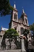 The exterior is built of light-colored stone, with two symmetrical towers flanking the main entrance. Each tower is topped with a steeply pitched spire, and the façades are decorated with carved reliefs and ornamental detailing. Large stained glass windows allow natural light to filter into the interior, creating a vivid interplay of color and shadow.[7]