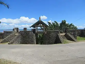 The most prominent historical site in the city is Buton Palace Fortress, sometimes known as Wolio Fortress, which contains a royal complex. It was constructed around the 16th century, starting during the reign of Sultan La Sangaji and ending under Sultan La Buke.[54] In local folk legend, the fortress's construction was so time-consuming that subjects who took part were unable to work elsewhere, and the siolimbona, the sultanate's legislative body, threatened to impeach the sultan who insisted on continuing it. Due to the presence of this fortress and several others around the city, Baubau is nicknamed the "city of thousand fortresses".[55] These fortresses, including Wolio, were all built using carved coral reefs and limestone and were used as the main defense infrastructure of the sultanate.[55] Fortresses were so ubiquitous a part of the sultanate's infrastructure that the Wolio language word for "fortress" is synonymous with "city", and every single kadie (administrative division of Sultanate of Buton) had at least one fortress built on it.[55] The fortress itself and the complex inside of it were declared to be cultural heritage by Indonesia's Ministry of Education, who granted it legal protection. It is also the largest fortress in the Indonesian archipelago by land area, at 22.8 hectares, and has a circumference of 2,740 meters.[55] The fortress has a trench of around 1.5 kilometers in length which is divided into several parts for defensive purposes. Each part (baluara) of the fortress, is divided by internal walls and armed with cannons. It also has twelve gates (lawa) scattered around the fortress's outer layer. The inner part of the fortress is an old settlement complex said to have been founded by migrants from Johor and divided into limbo, each of which had administrative functions and a royal official. Inside this part is the royal mosque, built in 1712. The fortress also contains a 21-meter wooden flagpole, traditionally called kasulana tombi, which was built that year and is thought by Indonesian historians to be the oldest flagpole in the world still standing.[55][56] In 1871, the flagpole was struck by lightning, resulting in parts of it being replaced. In 2020, due to its old age and to prevent further damage, the flagpole was reinforced by the city government with additional supports and a protective structure made of iron.[55]