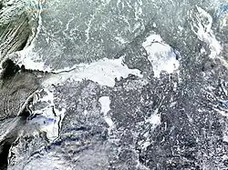 Satellite image showing the gulf entirely frozen over in January 2003