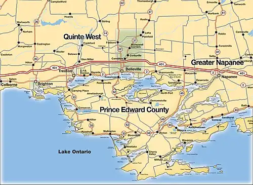 The Greater Bay of Quinte area includes the municipalities of Brighton, Quinte West, Belleville, Prince Edward County, and Greater Napanee as well as the Native Tyendinaga Mohawk Territory. Overall population of the area exceeds 200,000.[4]