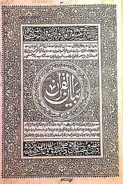 Bayan al-Quran (Urdu: بیان القرآن) is an early 20th-century Urdu translation and commentary of the Quran by Ashraf Ali Thanwi, completed in 1905 and first published in 1908 in twelve volumes from Delhi. A revised version, titled Complete Bayan al-Quran, was released in 1935. Thanwi developed the work as a direct response to the translations and interpretations of Nazir Ahmad Dehlvi, Mirza Hairat Dehlvi, and Syed Ahmad Khan, whose approaches he disagreed with. The translation is influenced by the works of Shah Abdul Qadir and Mahmud Hasan Deobandi,[1] while the commentary is primarily influenced by Ruh al-Ma'ani.[2] Its key themes include hadith-based interpretations, jurisprudential discussions, and mysticism. It also stands out as the first Urdu exegesis to explore the mystical dimensions of Quranic verses in depth.[3] The translation and interpretative style of Bayan al-Quran were later adopted and expanded upon by scholars such as Abul Kalam Azad.[4] It served as the primary source for compiling Tafseer-e-Majidi and also formed the foundation for Ma'arif al-Quran, a summarized version of this work.