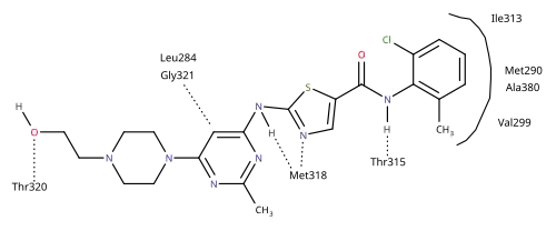 Dasatinib has some structural elements in common with nilotinib, in particular the juxtaposition of the aminopyrimidine and the carboxamide groups. The aminothiazole segment of dasatinib makes a bi-dentate H-bonding interaction with the backbone CO and NH of Met-318 and the amide-NH makes an H-bond with the side chain oxygen of Thr-315.[12]