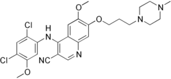 Bosutinib's structure is based on a quinoline scaffold and is structurally related to the AstraZeneca quinazoline template.[12] Src kinase dependent yeast screening led to characterization of a 4-anilino-3-quinolinecarbonitrile as an Src inhibitor. Combination of the features of this hit and a related compound, and attachment of solubilizing groups, led to the discovery of bosutinib. It was suggested to be an Abl kinase inhibitor and when tested as such it turned out to be slightly more potent against Abl than Src (IC50 1,4 nM vs. 3,5 nM).[25] Bosutinib's activity was first described in 2001 and it was disclosed as an Abl kinase inhibitor in 2003. At first it was believed that bosutinib was a selective Src kinase inhibitor but now it is known that its kinase inhibition profile is far less restricted than originally thought. Bosutinib inhibits Src, Abl and a wide range of both tyrosine and serine-threonine kinases.[25]