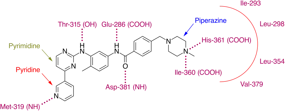 Imatinib binds to Abl domain via six hydrogen bond interactions. This stabilizes the imatinib Bcr-Abl complex and prevents ATP from reaching its binding site.[5][9][11] The hydrogen bonds involve the pyridine-N and backbone-NH of Met-318, the aminopyrimidine and side chain hydroxyl of Thr-315, the amide-NH and side chain carboxylate of Glu-286, the carbonyl and backbone-NH of Asp-381, the protonated methylpiperazine with the backbone-carbonyl atoms of Ile-360 and His-361. Additionally, a number of van der Waals interactions contribute to binding.[9] A hydrophobic pocket is formed by amino acid residues Ile-293, Leu-298, Leu-354 and Val-379 around the phenyl ring adjacent to the piperazinyl-methyl group of imatinib.[11] At the time of its discovery, in the absence of structural information, no clear explanation for the impressive selectivity of imatinib could be found.[7]