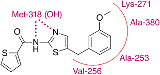The binding of substance 14 is partly similar to dasatinib, the aminothiazole segment of substance 14 makes a bi-dentate H-bonding interaction with the backbone CO and NH of Met-318 while the methoxy-benzene falls nicely into a hydrophobic pocket created by Val 256, Ala 253, Lys 271 and Ala 380.[36] Whilst the similar binding properties to those of dasatinib, suggests the possibility of producing Bcr-Abl TKI's from thiazole cores is real, the question remains open whether this research will just lead to a dasatinib analog or a novel way to inhibit TKs.