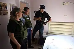 The kibbutz's 13-member security team responded to the infiltration.[35][36] Arik Kraunik, the head of the security team, spotted the first Hamas militants as they approached the main entrance of the kibbutz on motorcycles. He notified the IDF and residents, and instructed the other members of the security team to meet at the kibbutz armory, which had most of their assault rifles. Kraunik approached the main entrance as two militants breached it and was killed in an exchange of fire. The two militants then moved through the kibbutz towards the northwestern side where additional militants were streaming in, killing civilians and members of the security team along the way. Meanwhile, Ilan Weiss, the deputy commander of the security team who lived on the western side of the kibbutz, was killed by militants as he headed towards the armory. His body was seized and taken to Gaza. As only Kraunik and Weiss had the keys to the armory, the surviving members of the security team had no access to the arsenal of assault rifles. They had between them six M16 assault rifles and some pistols.[1][36]