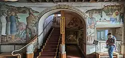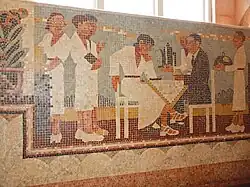 Lucien Labaudt painted the elaborate San Francisco Life fresco mural in 1936 and 1937.[5] The mural extends from the top of the wainscot to the ceiling of the first floor entrance lobby and wraps around all four walls, split into nine sections, each approximately 9 ft (2.7 m) tall and covering an aggregate area of 1,500 sq ft (140 m2).[10] It depicts real people and scenes from San Francisco in the 1930s, encompassing the beach, Golden Gate Park, Fisherman's Wharf, and the Marina District.[14]