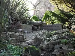 As originally designed, the memorial consisted of a circular mound planted with shrubs and a rockery with streams and pools of water, two boulders with carved wording, and two stone pigeons.[9][10][12] The pigeon sculptures have since been stolen and not replaced, and a fence has been added around the mound.[12] One stone bears the words in memory of warrior birds who gave their lives on active service 1939–45 and for the use and pleasure of living birds; the other reads a bird of the air shall carry the voice and that which hath wings shall tell the matter. this memorial is presented by nancy price and members of the people's theatre, london.[12] The line A bird of the air shall carry the voice and that which hath wings shall tell the matter is a quote from the Book of Ecclesiastes in the Old Testament (Eccl 10:20).[13] A metal panel next to the entrance gate in the fence repeats most of the details from the first stone.[12] The stones, which were quarried in the Forest of Dean, were refurbished and repainted in 1999,[12] and Worthing Borough Council continues to maintain the memorial.