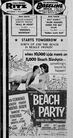 Beach Party is a 1963 American film and the first of seven beach party films from American International Pictures (AIP) aimed at a teen audience.[5] This film is often credited with creating the beach party film genre.[6][7][8][9]