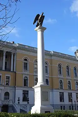 The monument was originally located on the summit of the 138 foot Beacon Hill, until the hill was cut down from 1804 to 1829 to fill in Mill Pond, the area around today's Canal and Causeway Streets.[3] During this process in 1811 the monument was destroyed, albeit with the original plaques preserved. A 1:1 scale replica of the monument was created in 1898 and placed in its present location behind the Massachusetts State House, where the summit of Beacon Hill used to be.