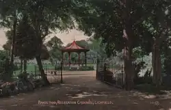 As the city water supply from Aldershawe was diminishing in the early 19th century, money was spent diverting surface waters from 'Swan Moggs' into a common conduit.[4] The two streams across it were diverted into underground culverts; the land was raised with silt and mud dredged from Minster Pool.[5] The area was subsequently developed into the formal gardens of Beacon Park by the Lichfield Corporation, but paid for by the Conduit Lands Trust. The Museum Gardens were opened in 1859 to complement the new Italianate Free Library and Museum.[5] The Recreation Grounds, opened in 1891, is the small area between the Museum Gardens and the wider Beacon Park. The central fountain was unveiled as the central focus of the Museum Gardens in 1871. A bandstand was also installed close to the junction of the Museum Gardens and Recreation Grounds, and was positioned to provide a focus for the avenue through the Museum Gardens.[3]