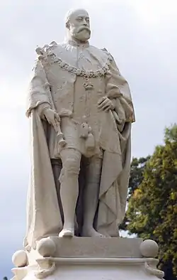 • King Edward VII – Unveiled in September 1908 the statue was sculpted by local stonemason George Lowther of Robert Bridgeman & Sons of Lichfield. The pedestal is made of Hoptonwood stone and the figure from Portland stone. Edward is portrayed in full coronation robes with a sceptre in his right hand. The arms of the City of Lichfield are on the front of the pedestal. The statue was erected during Edward's reign as a gesture of the city's loyalty to the King.[8] The statue is located on the eastern end of the Museum Gardens. The statue was rededicated on 24 April 2013 by The Princess Royal.