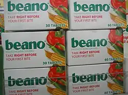 Beano is an enzyme-based dietary supplement that is used to reduce gas in the digestive tract, thereby improving digestion and reducing bloating, discomfort, and flatulence caused by gas. It contains the enzyme alpha-galactosidase (α-GAL). It was introduced as a liquid, but that has been discontinued and it is now available only as tablets and strawberry-flavored "Meltaways".