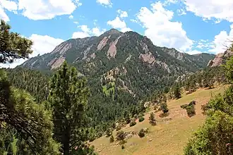 Bear Peak is a mountain summit in the Front Range of the Rocky Mountains of North America. The 8,459-foot (2,578 m) peak is located in Boulder Mountain Park, 5.2 miles (8.3 km) south-southwest (bearing 206°) of downtown Boulder in Boulder County, Colorado, United States.[1][2][3][4][5][6][7]