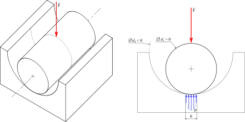As in the case of cylinder-cylinder contact, when the parts are modeled as elastic bodies with a negligible clearance, then the pressure can be modeled with a sinusoidal repartition:[6][12]