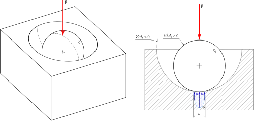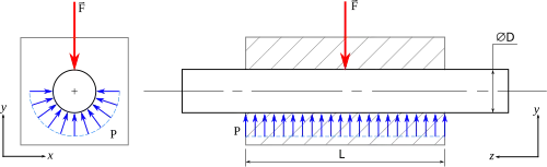 Bearing pressure is a particular case of contact mechanics often occurring in cases where a convex surface (male cylinder or sphere) contacts a concave surface (female cylinder or sphere: bore or hemispherical cup). Excessive contact pressure can lead to a typical bearing failure such as a plastic deformation similar to peening. This problem is also referred to as bearing resistance.[1]
