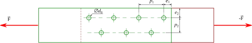 In this case, the acceptable pressure limit is calculated from the ultimate tensile stress fu and factors of safety, according to the Eurocode 3 standard.[1][14] In the case of two plates with a single overlap and one row of bolts, the formula is:
