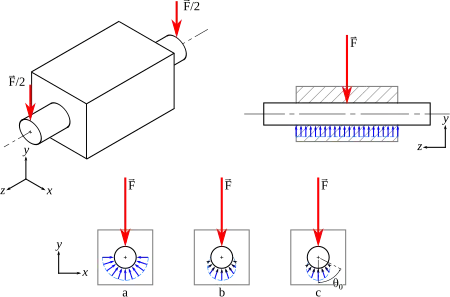 In plain bearings, the shaft is usually in contact with a bushing (sleeve or flanged) to reduce friction. When the rotation is slow and the load is radial, the model of uniform pressure can be used (small deformations and clearance).