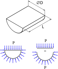 Second, we can integrate the pressure elementary forces. Consider a small surface dS on the cylindrical part, parallel to a generating line; its length is L, and it is bound by the angles θ and θ + dθ. This small surface element can be considered as a flat rectangle which dimensions are L × (dθ × D/2). The pressure force on the surface is equal to