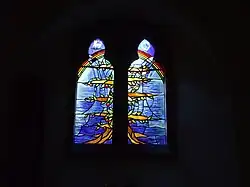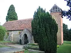 The head is pointed and of one square order, probably a later alteration. In the south wall is another blocked doorway with square pilaster-jambs and pointed head, perhaps of the 13th century but difficult to date. The two buttresses to each wall are medieval. The west wall and porch-tower are of red brick. The bell-cote is of wood. The main roof is tiled.[2] One of the three bells is medieval.[10] There is now a single bell by Wm Blews inscribed MARIA, fleur de Lys, Queen, King, fleur de lys MARIA that was made by re-casting two bells when the building was re-modelled in 1875.[11] The Millennium Window by Art of Glass, Earlswood (River of the Water of Life) 2001 donated by Audrey Payne in memory of her late husband.