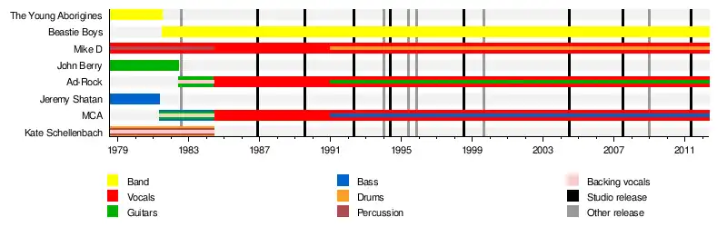 The Beastie Boys were an American hip hop and rap rock group formed in New York City in 1981.[1] They were composed of Adam "Ad-Rock" Horovitz (vocals, guitar), Adam "MCA" Yauch (vocals, bass), and Michael "Mike D" Diamond (vocals, drums). The Beastie Boys were formed out of members of experimental hardcore punk band the Young Aborigines, which was formed in 1979, with Diamond on drums, Jeremy Shatan on bass guitar, John Berry on guitar, and Kate Schellenbach later joining on percussion.[2] When Shatan left New York City in mid-1981, Yauch replaced him on bass and the resulting band was named the Beastie Boys. Berry left shortly thereafter and was replaced by Horovitz.