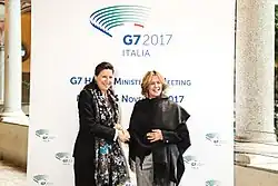 She was re-elected deputy in the 2013 general election; the elections resulted in a hung parliament, and no political coalitions had a majority of seats to govern alone.[7][8] So the two main parties, the centre-left Democratic Party, the centre-right People of Freedom, supported by the centrist Civic Choice, established a Grand coalition government, led by the vice secretary of the PD, Enrico Letta.[9]