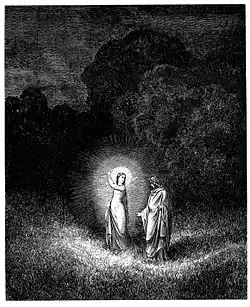 Despite representing divine love, Beatrice's appearance to Dante in the Garden of Eden in Purgatorio is not a joyous reunion. She berates him for weeping when Virgil disappears, and then for abandoning her memory after her death and indulging in sin to such a degree that she had to intercede on his behalf to save him.[1] As Beatrice guides Dante through the spheres of Heaven, she grows increasingly beautiful and indescribable, representing Dante's progress towards God. She frequently corrects Dante during his journey, acting as a spiritual guide and source of wisdom. Contrary to her initial harsh treatment, throughout Paradiso Beatrice is encouraging and patient towards Dante, taking joy in his gradual progress. When they reach the Empyrean, she leaves him to take her proper place there. Saint Bernard guides Dante for the final portion of his journey. He points out Beatrice's place in the Empyrean among several glorified women from the Bible.